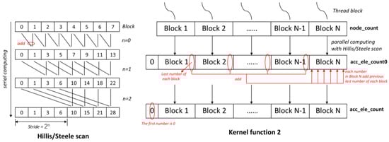 Kernel function 2 computes the prefix sum for node_count and represents the most time-consuming component of the entire program, aside from data transmission; however, it possesses a high potential for optimization. This article systematically introduces the complete algorithm, with plans for further optimization of kernel function 2 in future work. The process to achieve the result involves two steps (see Figure 4). First, node_count is partitioned into several blocks; subsequently, within each block, the Hillis/Steele scan algorithm is employed to compute the prefix sum of the data contained in that block, resulting in acc_ele_count0 for the whole data. The rationale behind dividing it into multiple thread blocks lies in the limitations on thread block size and the inability to share data across different thread blocks. Additionally, it should be emphasized that acc_ele_count0 initializes at zero while subsequent entries automatically extend back by one position. Utilizing this acc_ele_count0 allows each thread to add every last number from its preceding thread block onto itself, thereby yielding an updated value for acc_ele_count. The method of obtaining acc_ele_count0 is shown in Algorithm 2.