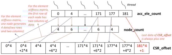 Kernel function 4 is used to obtain the data of CSR_offset. CSR_offset data store the row index of the non-zero element. For the element stiffness matrix, one node generates 2 × 2 data (two rows and two columns). Figure 6 shows the generation of CSR_offset for the global stiffness matrix in detail. The first index always starts at 0. The first node is shared by an element, which means that there are four nodes associated with it (including itself), so the first row has eight data points, so the second index starts at eight. There are also eight data points in the second row, so there are 16 data points before the third row. And then all the indexes are acquired in the same way. One thing to note is that the last index is the sum of all the previous elements plus 1 (see Algorithm 4 for details).