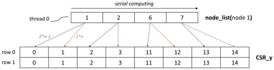 Kernel function 5 is used to obtain the data of CSR_y. CSR_y data are used to store column index information for non-zero elements. A node of the stiffness matrix generates 2 rows of data, and the CSR_y value of the two rows is the same. A node generates two columns of data, and the CSR_y value for these two data can be generated from node_list, as shown in Figure 7. The detailed calculation process is shown in Algorithm 5.