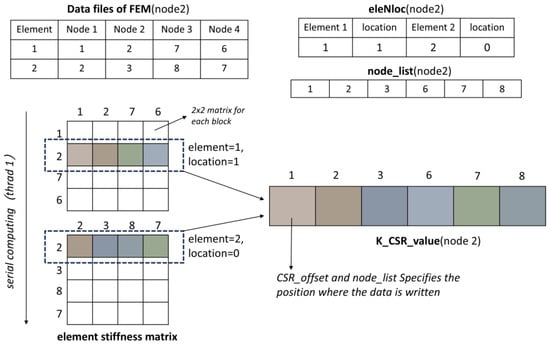 Kernel function 6 is used to obtain the data of CSR_value. CSR_value data are the non-zero data in the matrix (in general). As shown in Figure 8, the generation of CSR_value data for the global stiffness matrix through node 2 is illustrated. eleNloc is used to obtain which elements node 2 is contained in and where it is located. Then node information can be obtained from data files of FEM, and the element stiffness matrix can be generated. The obtained element stiffness matrices can be indexed to the required number of rows by location in eleNloc. For instance, the first element matrix of node 2, the data in the second row is indexed, and then the column in which it is located is extracted and compared with node_list so that the position of these nodes in K_CSR_value can be known. From CSR_offset we know that the index of the first data from node 2 in K_CSR_value (16 in this case). The function is shown in Algorithm 6.