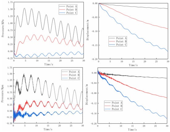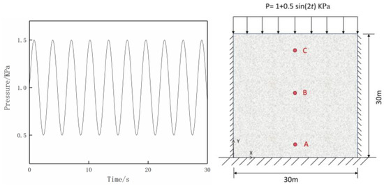 The program is employed to address the two-dimensional saturated soil dynamic issue under sinusoidal loading. The model and load are depicted in Figure 9. The material parameters are shown in Table 1. The surface of the model constitutes a free permeable boundary subjected to full sinusoidal load, while the other three sides are impermeable to water. The boundary on the left and right sides limits lateral displacement, and the boundary on the bottom limits horizontal and vertical displacement. Set three points, A(15,3), B(15,15), and C(15,27), as observation points. Observe the displacement in the y direction and the pore pressure response (with the coordinate origin in the lower left corner). The material properties of the soil are presented in Table 1. The initial pore pressure is 0.