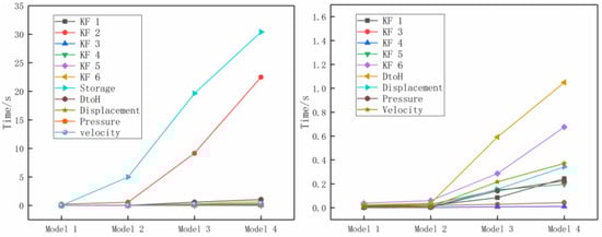 Four models are utilized: Model 1 with a mesh size of 0.64 million, Model 2 at 1 million, Model 3 at 4 million, and Model 4 at 6.24 million. The calculation accuracy was set to double precision, with a thread block size of 16. As illustrated in Figure 12 (left), among the four models, model size exerts the most significant influence on Kernel function 2, which exhibits exponential growth and necessitates further optimization. Additionally, model size substantially affects data storage; however, this is limited by CPU performance. As illustrated in Figure 12 (right), Kernel function 6 also has a large influence on model size, but its computation time is small, and it is only computed once. In the iterative solution, the computation time of the three vectors escalates marginally with the expansion of the model size. This escalation becomes conspicuous when there are numerous iterative steps in the calculation. DtoH (Centralized_DtoH in Table 2) also increases exponentially with the rise of the model size, and this growth will rise sharply with the increase of iteration steps. However, this is contingent upon computer hardware specifications.