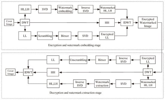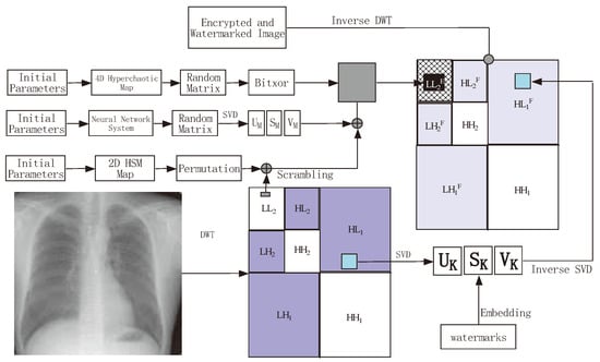 The proposed security method will be introduced carefully. First, the medical image is encrypted with SVD computing and chaotic maps, and then the watermarking method is discussed. The watermarking algorithm should concern the visual effect. Both medical image encryption and watermarking are performed based on SVD computing in the DWT domain. For an accurate diagnosis, the watermarked medical images should not be affected. The proposed JEW scheme is shown in Figure 2. First, we perform DWT on the original medical image. Second, we encrypt the LL sub-band and embed the watermark information into middle-frequency sub-bands. Finally, SVD diffusion will be operated according to the specific privacy protection request. We describe the proposed model with Algorithm 1 as follows: