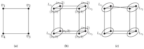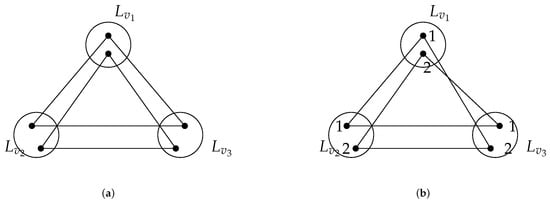 For every , distinct matchings between and correspond to different covers of G. If the matching between and is , an -coloring of G becomes equivalent to a list coloring of G. It indicates that DP-coloring serves as a generalization of list coloring, leading to the conclusion that . From Figure 1, has an independent set ; hence, has an -coloring with vertices colored 1 and vertices colored 2, and this corresponding coloring is also a 2-list coloring of . However, does not have an -coloring for and has no 4-independent set. So, . The fact that and marks an important difference between DP-coloring and list coloring.