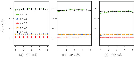 Table 1, Table 2 and Table 3 show the simulation results when the covariates are generated according to the three scenarios, where CP denotes the censoring ratio of the response variable, n is the sample size, and columns 3–12 show the results of CQ and SCQ at different quantiles. From the estimation results, when the regression errors are generated by symmetric distributions, i.e., t and Laplace distributions, SCQ has higher accuracy than CQ, especially at the lower and higher quantiles. When the regression error term is generated by the distribution, the estimation accuracy of CQ decreases as increases from a global perspective, and the estimation accuracy of SCQ is much better than that of CQ at the higher quantiles, although CQ is better than SCQ at the lower quantiles. This may be because the density function of the distribution is biased and the observations are excessively clustered in the lower quantiles, so that CQ decreases in estimation accuracy as the number of quantiles increases, while SCQ maintains better estimation accuracy. It can be seen from Table 1, Table 2 and Table 3 that SCQ is more stable than CQ, regardless of whether the error terms follow symmetric or asymmetric distribution. Specifically, the estimation accuracy of SCQ is almost the same in all quantiles, while that of CQ fluctuates with the change of , especially in the case of the asymmetric distribution of the error terms. Overall, the estimation accuracy of CQ depends greatly on the value of , the size of the censoring ratio, and the distribution of the error term, while the estimation effect of SCQ is minimally affected by these factors and shows good robustness.