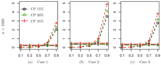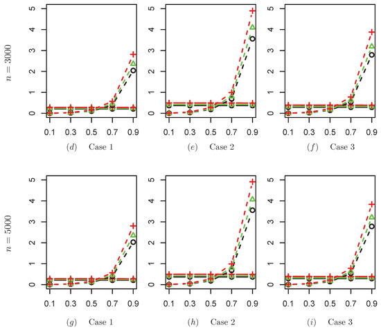 - Case 3: The p-dimensional covariate consists of a mixture of distributions, where the first -dimensional covariate is generated from a multivariate uniform distribution on , and the covariance matrix is ; the second -dimensional covariate is generated by with mean , where the jth component , and covariance matrix , where