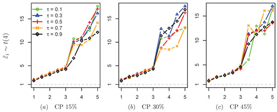 The ratio of DMSE between CQ and SCQ is firstly calculated, and the simulation results of the covariates under Case 1 are displayed in Figure 1. Since the results of the three covariate generation cases are very similar, we do not show the results of Case 2 and Case 3. The results in Figure 1 show that the ratio of DMSE estimated by CQ and SCQ is not significantly affected by changes in sample size and dimensionality. When the regression error terms are generated by symmetric distributions, i.e., the t-distribution and -distribution, the DMSE ratios of the regression coefficients estimators between CQ and SCQ remain above one. This indicates that SCQ has a higher precision compared with CQ, especially in the case where the difference between the lower quantile of and the upper quantile of is more obvious, and the ratio of DMSE for regression coefficients’ estimators between CQ and SCQ can reach three. When the error term is generated by the asymmetric distribution, the ratio of DMSE between CQ and SCQ is less than one at the low quantile level, and CQ is superior to SCQ in this case. However, the ratio of DMSE between the two methods increases as increases, and the ratio reaches around 10 when . In order to clarify the reason for this phenomenon, we calculate the DMSE of two estimation methods when the error term is generated by the distribution. As shown in Figure 2, CQ performs better when = 0.1. As increases, the DMSE of CQ increases while its growth rate gradually increases. The CQ’s DMSE is significantly higher than the SCQ’s when , whereas the SCQ’s DMSE stabilizes at each quantile point in a straight line. The observed phenomenon aligns with its lower-dimensional counterpart, underscoring that the estimation accuracy of the CQ depends on the magnitude of , the censoring ration of response variables and the distribution characteristics of the error term. In contrast, the estimation accuracy of the SCQ exhibits robustness against variations in these factors.