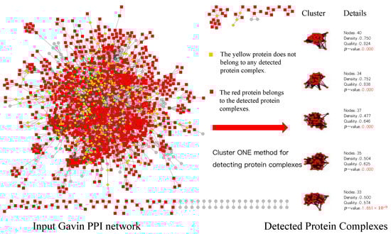 Various PPI datasets have been generated with the popularity of high-throughput rapid detection technologies. These datasets can be naturally expressed as a network. Specifically, proteins are represented by network nodes, and their interactions appear as edges in the network. Generally, closely connected subgraphs in the PPI network are assumed to be real protein complexes. Identifying such protein complexes in the PPI network is significant for understanding life activities and exploring life science. The PPI network is a ‘small-world’ network [8,9], and dense subgraphs or modules thereof typically correspond to protein complexes [10,11]. Mining protein complexes in the PPI network has excellent theoretical significance for investigating the complex activities of life, interpretation of life mysteries, and understanding the intrinsic organizations and processes of complex life networks at the system level. Additionally, detecting protein complexes is of great scientific and commercial value for recognizing pathogenic genes, phenotypic effects of gene mutations, and the evolution of biological networks [12].