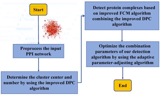 Methods for the detection of overlapping protein complexes were investigated. The DFPO algorithm comprises preprocessing of the PPI network, determination of the initial clustering center and number of the FCM algorithm by using the improved DPC algorithm, protein clustering by using the FCM algorithm, parameter optimization of the detection algorithm by using adaptive parameter-adjusting algorithms, and evaluation of the effectiveness of the proposed algorithm based on various evaluation metrics. Figure 2 illustrates the flowchart of the present study.