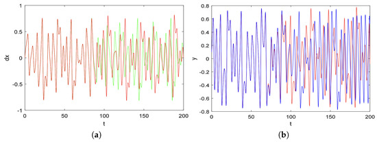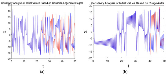 Then, we use the Gauss–Legendre integral algorithm to solve Equation (11) and analyze the initial value sensitivity, and the obtained phase diagram is shown in Figure 1. When we set the initial values of Equation (11) to and , the sensitivity analysis of the initial values obtained is shown in Figure 2. From the analysis of Figure 1 and Figure 2, it can be found that the Gauss–Legendre integral algorithm can also solve and analyze the first-order differential equations correctly.