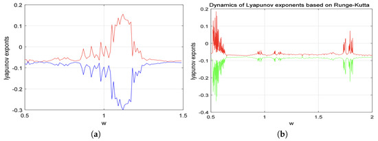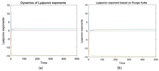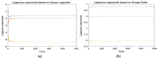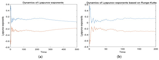 Lyapunov exponent of System (3). (a) Lyapunov exponent based on Gauss–Legendre integral; (b) Lyapunov exponent based on Runge–Kutta.