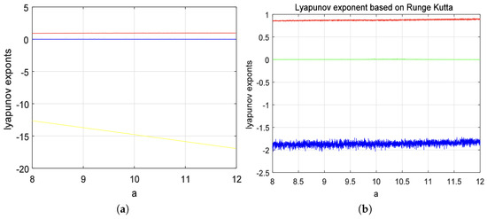 (a) Lyapunov exponent spectrum for parameter a based on Gauss–Legendre; (b) Lyapunov exponent spectrum for parameter a based on Runge–Kutta.
