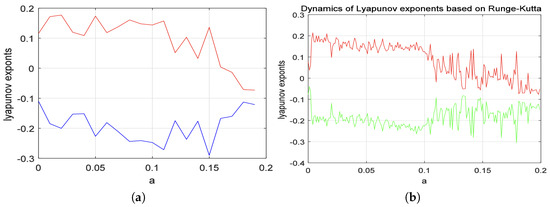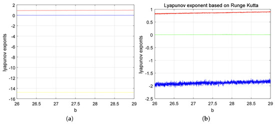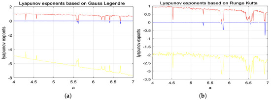 In this paper, we integrate the Gauss–Legendre integral algorithm into the Wolf method to analyze the Lyapunov exponent and the Lyapunov exponent spectrum of the Lorenz system. We calculate , and with the step size of 0.01 and the initial values . At the same time, we calculate Lyapunov exponents , , by the Runge–Kutta method. From the value of Lyapunov exponent LE2 obtained by the two algorithms, the value of LE2 obtained by the Gauss–Legendre integration is closer to zero than that obtained by Runge–Kutta. From the analysis of the calculation results, we know that the Lorenz system is in a dissipative chaotic state, which is consistent with the conclusion obtained by the Runge–Kutta calculation. The Lyapunov exponent is shown in Figure 3. Then, we analyze the Lyapunov exponent spectrum and select parameters a and b for analysis. When other parameters are constant, we choose the variation interval of parameter a as . The Lyapunov exponent spectra obtained by Gauss–Legendre and Runge–Kutta algorithms are shown in Figure 4a,b. From Figure 4a,b, we know that Lorenz systems are chaotic in this interval. Similarly, when other parameters are constant, we choose the variation interval of parameter b as , Similarly, the Lyapunov exponent spectra obtained by Gauss–Legendre and Runge–Kutta algorithms are shown in Figure 5. From Figure 5a,b, we also know that the Lorenz system is chaotic in this interval. From Figure 4 and Figure 5, we find that the results calculated by the Gauss–Legendre integral are much more stable than those calculated by Runge–Kutta. In Figure 4b and Figure 5b, it is obvious that the curves obtained are very unstable, while the curves obtained in Figure 4a and Figure 5a are very stable. This is because the Gauss–Legendre algorithm is a high-precision numerical algorithm, while the Runge–Kutta algorithm is an interpretive solution, which has great dissipation.