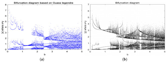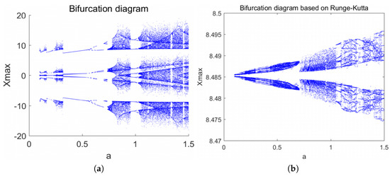 (a) Bifurcation diagram of parameter a with x based on Gauss–Legendre; (b) Bifurcation diagram of parameter a with x based on Runge–Kutta.