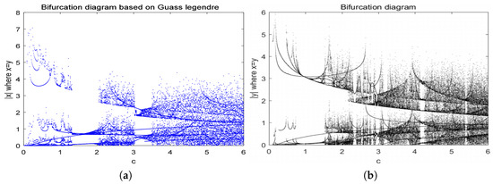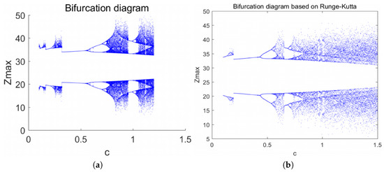 (a) Bifurcation diagram of parameter c with z based on Gauss–Legendre; (b) Bifurcation diagram of parameter c with z based on Runge–Kutta.
