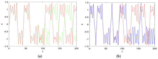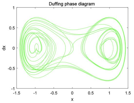We directly use the Gauss–Legendre integral to compute Equation (12) since the Duffing system is a second-order differential equation that also includes the damping term of the first-order derivative. There was no reduction in order during the computation, but instead two integrations were performed to obtain x. Firstly, we conducted initial value sensitivity and phase diagram analysis, assuming that the initial value for red is and the initial value for green is , with a step size of 0.01 and a simulation time of 200. The obtained sensitivity analysis of the initial values and the phase diagram of System (12) are shown in Figure 9 and Figure 10. Figure 9 and Figure 10 show that both x and the first derivative thereof present initial value sensitivity. The phase diagram of the resulting System (12) is shown in Figure 11, which is basically consistent with the Duffing system’s phase diagram obtained by the Runge–Kutta methods. This indicates that the process and results of solving System (12) using the Gauss–Legendre Integral are correct.