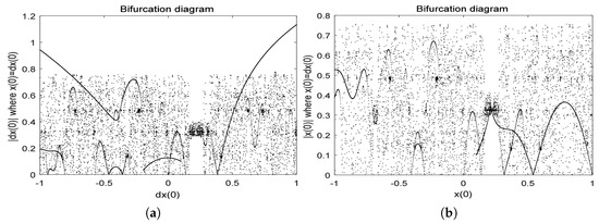 (3) In Figure 17a,b, there is a concentrated dense point, which shows that there is a chaotic attractor in this interval when the initial value changes. It can help us determine the interval of the attractor and pseudo-attractor of a chaotic system, but it cannot distinguish an attractor from a pseudo-attractor.
