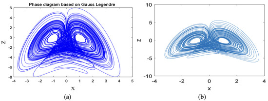 Lorenz system phase diagram based on Gauss–Legendre. (a) x-y plane phase diagram; (b) x-z plane phase diagram.