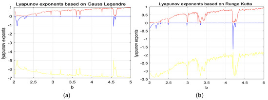 (a) Lyapunov exponent spectrum for parameter b based on Gauss–Legendre; (b) Lyapunov exponent spectrum for parameter b based on Runge–Kutta.