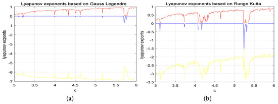(a) Lyapunov exponent spectrum for parameter c based on Gauss–Legendre; (b) Lyapunov exponent spectrum for parameter c based on Runge–Kutta.