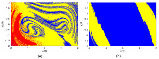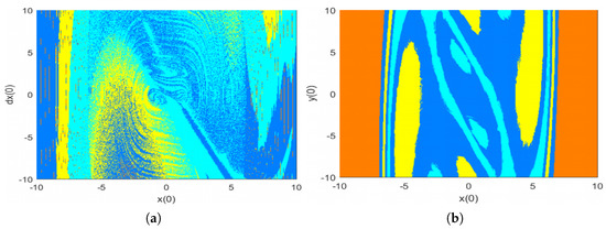 Figure 27a and Figure 28a and Figure 27b and Figure 28b are compared, where Figure 27a and Figure 28a represent the basin of attraction of the Duffing system obtained through the Gauss–Legendre quadrature and Figure 27b and Figure 28b represent the basin of attraction of the Duffing system obtained through the Runge–Kutta method. By contrasting these two sets of figures, it can be clearly found that the results obtained are dramatically different, under the same conditions of the analysis method of the basin of attraction, with only different quadrature methods. Figure 27a and Figure 28a clearly reflect that the basin of attraction has a symmetric manifold structure, whereas Figure 27b and Figure 28b only capture a symmetric structure of the basin of attraction. Therefore, it can be thought that the Gauss–Legendre quadrature’s analysis method of the basin of attraction is superior to that using the Runge–Kutta method. This is mainly because the numerical solutions of the chaotic system are obtained by the Gauss–Legendre quadrature, while the analytical solutions for chaotic systems are obtained by the Runge–Kutta method.