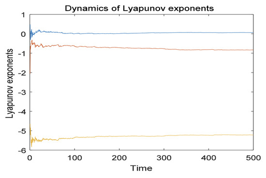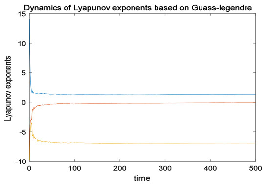 Similarly, we use the Gauss–Legendre algorithm and apply the Wolf method to obtain the corresponding Lyapunov exponent of System (16). The Lyapunov exponents calculated by the Gauss–Legendre algorithm are , , , as shown in Figure 35.