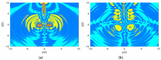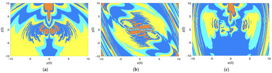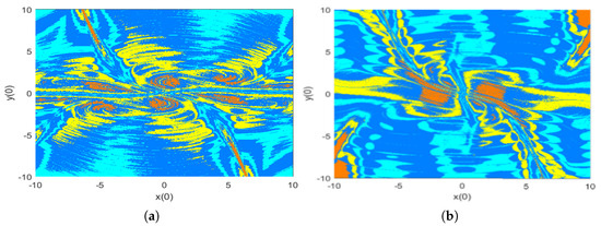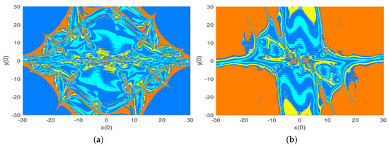 In Equation (15), H is the result of the decision, n is so that the value of H is within an appropriate range, and n can be freely set according to the actual situation. (the value of the blue curve in Figure 29) and (the value of the yellow curve in Figure 29) are the Lyapunov exponents of System (13) when the initial values and change. In this way, we can obtain the basin of attraction when and change, as shown in Figure 30a. By using the same method, we can obtain the graph of the basin of attraction when , and , change.