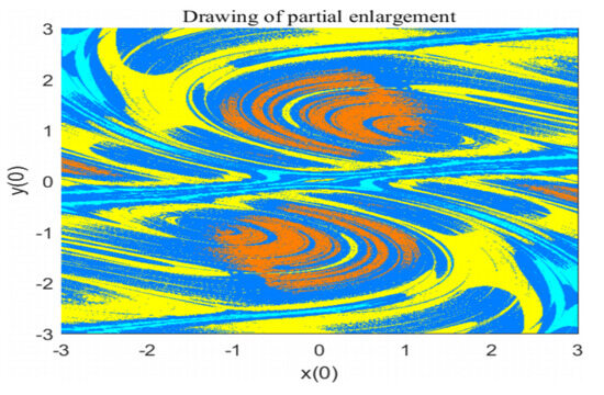 Figure 30b shows the basin of attraction of System (13) obtained through the Runge–Kutta quadrature, while Figure 30a shows the basin of attraction of sSstem (13) obtained through Gauss–Legendre integration. Upon comparing these two sets of images, the orange–yellow part in Figure 30a can reveal the structure of the basin of attraction more clearly, whereas in Figure 30b, the orange–yellow part only displays two regions of attraction in the middle of the image. In Figure 33, a partial magnification of Figure 30a, it can be clearly seen that there are only two symmetric regions of attraction in orange–yellow. Therefore, it can be believed that the results of the basin of attraction obtained through the Gauss–Legendre quadrature algorithm can better capture the structure of the basin of attraction in chaotic systems than those obtained through the Runge–Kutta method.