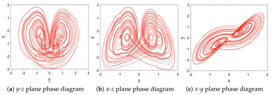 In this paper, we choose the hidden attractor chaotic system proposed in reference [35], and the system equation is shown in Equation (13). It is obvious that this system has an infinite number of equilibrium points, so it is a chaotic system with hidden attractors. Here, we provide parameters , and of Formula (13).