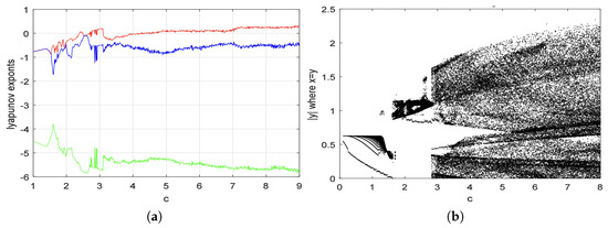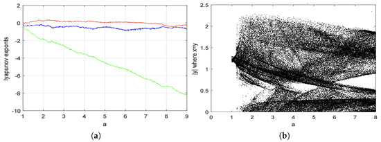 Then, we compare the Lyapunov exponent spectrum with the corresponding bifurcation diagram of parameter variation. When we set the variation intervals of parameters a, b and c at , their Lyapunov exponent spectrum and bifurcation diagram are shown in Figure 36, Figure 37 and Figure 38. We find that the Lyapunov exponent spectrum is consistent with the variation of the bifurcation graph.