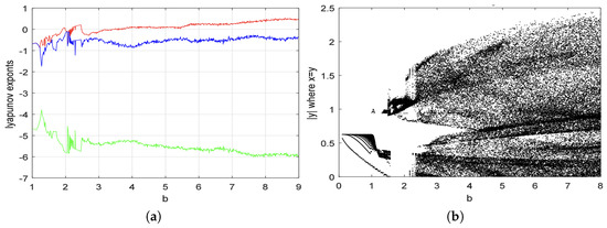 (a) Lyapunov exponent spectrum of parameter b; (b) Bifurcation of parameter b.