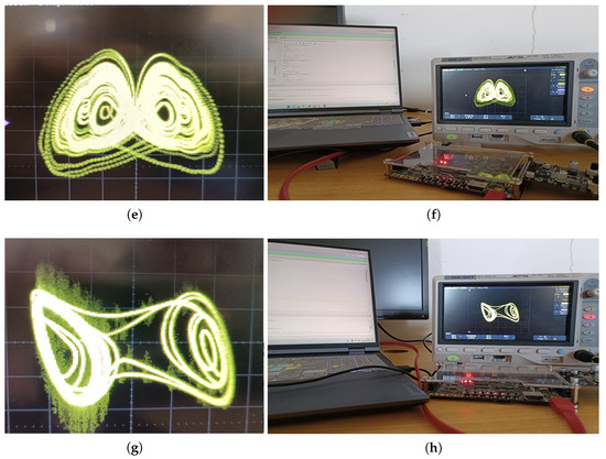 FPGA implementation of chaotic system based on Gauss–Legendre. (a) x-z plane phase diagram of System (11). (b) Experimental scenario diagram of System (11). (c) y-z plane phase diagram of System (13). (d) Experimental scenario diagram of System (13). (e) x-z plane phase diagram of System (16). (f) Experimental scenario diagram of System (16). (g) x-y plane phase diagram of System (12). (h) Experimental scenario diagram of System (12).