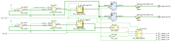 On the basis of FPGA technology, the hardware experiment of Systems (11), (12), (13), (16) is carried out by using the fixed-point number method. The Xilinx Zynq-7000 series XC7Z020 FPGA chip and the AN9767 dual port parallel 14 bit analog conversion module with the highest conversion rate of 125 MHz are used, and Vivado 17.4 and system generator are used to realize the joint debugging of Matlab2016a FPGA. The clock frequency of the FPGA system is 50 MHz, DA conversion frequency is 1666 Hz. In addition, we also use an oscilloscope to visualize the analog output. After the analysis, synthesis and compilation of Vivado. The correctness of the Gauss–Legendre integration algorithm and the chaotic system based on this algorithm is further verified. After confirming that the timing simulation result is correct, we use Vivado to generate a bit stream file and download it to the FPGA development board. At the same time, we use the AN9767 digital to analog converter to convert the output of FPGA into analog signals, connect the AN9767 digital to analog converter to an oscilloscope, and observe the phase diagram of Systems (11), (12), (13), (16) attractor. The phase diagram displayed by the oscilloscope is shown in Figure 40. The RTL view of System (11) is shown in Figure 41.