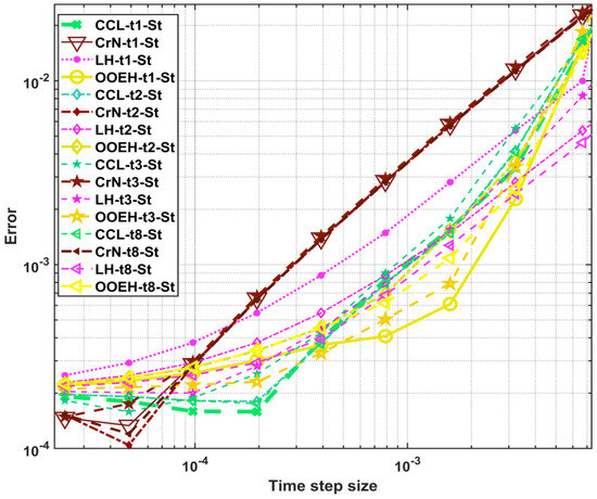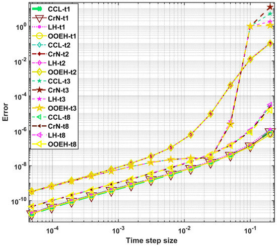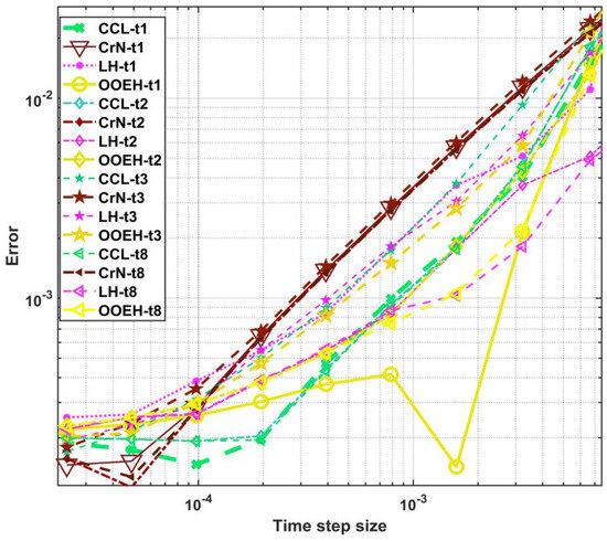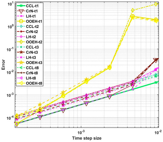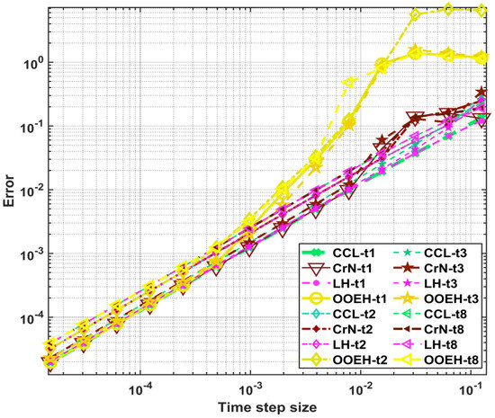 and , respectively. The CCL method has third-order temporal accuracy, and, similarly to the following three methods, it is proven to be unconditionally stable for the heat equation.