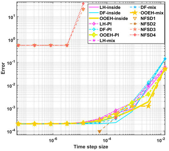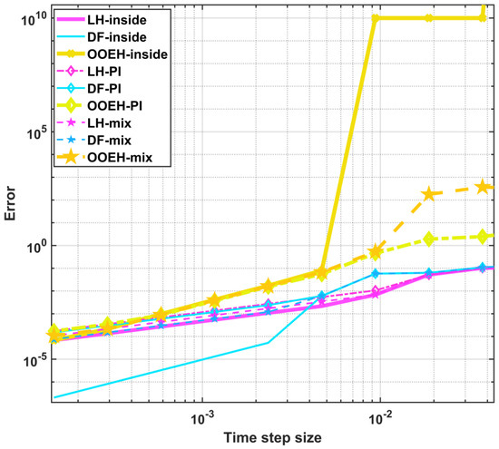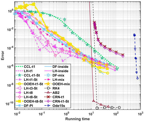 As we already mentioned, our goal is to assess the performance of the methods not only for one concrete time step size but for many. Hence, starting from a very large time step size, we calculate the above-defined errors for a series of decreasing time step sizes. This series of time step sizes usually starts from T/4 and has S elements, where the next element is obtained by taking half of the previous one. Then, we compute the three kinds of aggregated error, , , and , as the mean of the logarithm of these errors as follows: