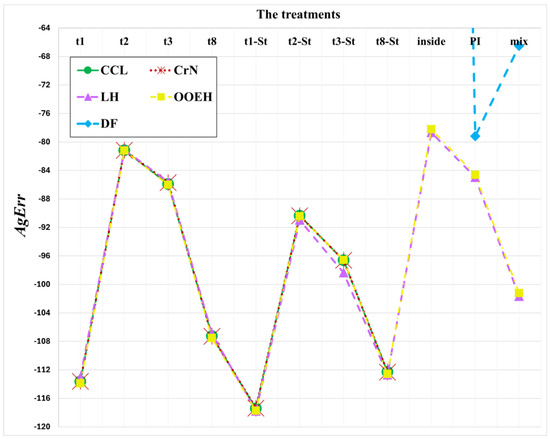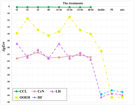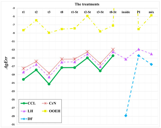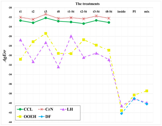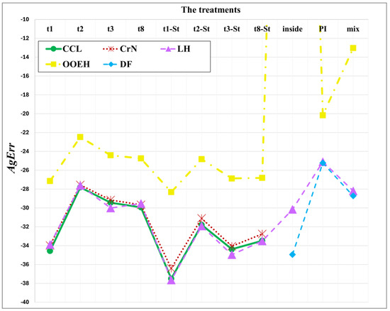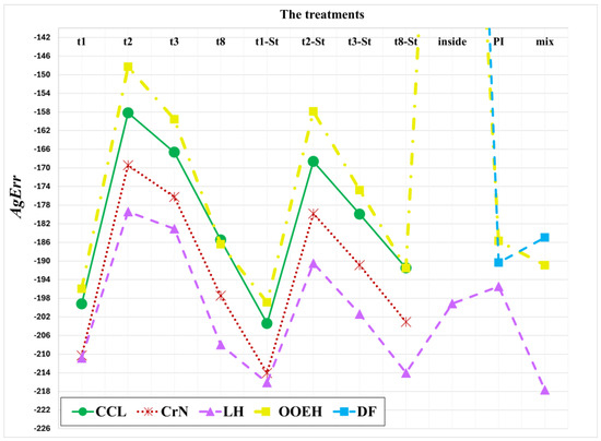 Aggregated errors (AgErr) as a function of the wavelength in the case of Experiment 13 for the top 7 methods.
