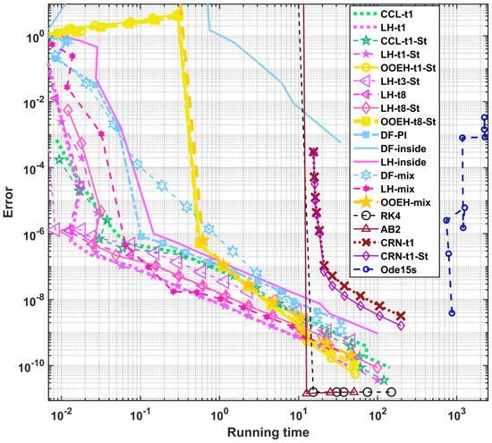 Along with the RK4, the two-step Adams–Bashforth [43] method (AB2) is also tested in Section 5. As far as we know, the performance of the explicit and stable methods has never been compared to the standard explicit multistep methods.