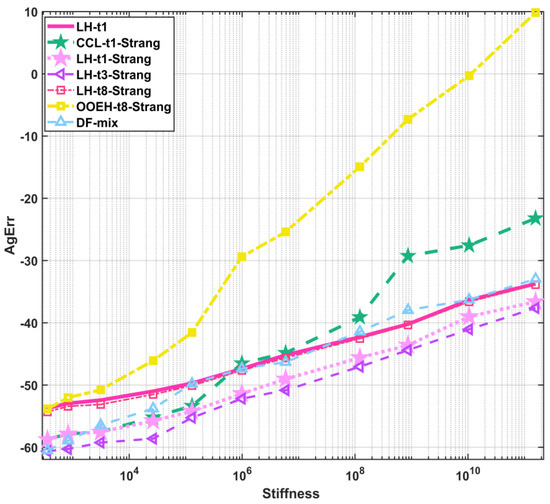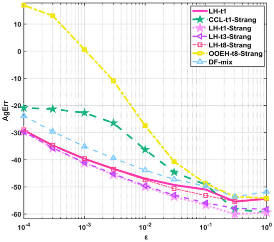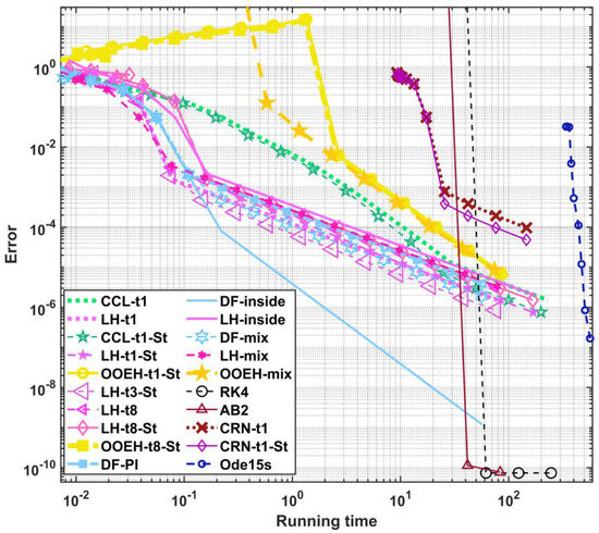 Figure 22 and Table 12 show the aggregated errors as a function of w in the case of Experiment 12 for the top seven methods. The maximum errors as a function of the time step size for w = 1 in the case of Experiment 13 for the top seven methods are presented in the Supplementary Materials (see Figure S10). This experiment shows that the accuracy of the methods only slightly depends on the initial function.