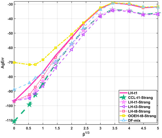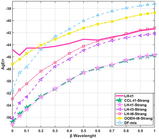 Aggregated errors (AgErr) as a function of the wavelength of the β function in the case of Experiment 14 for the top 7 methods.