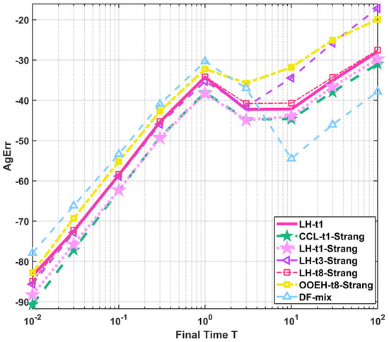 Since for large final times, the u values become very close to 1, as in the previous example for large values of β, we apply the same boundary conditions as in Experiment 11. Moreover, the series of time step sizes start from T/4; thus, the set of the used time step sizes is shifted with the final times. This choice, which is made to avoid extremely long running times, yields gradually increasing aggregated errors for most of the methods. Figure 21 and Table 11 show the aggregated errors as a function of the final time T in the case of Experiment 12 for the top seven methods. One can see that when T exceeds 1, there is a temporary decrease in the aggregated errors. This is because, by this time, the simulated system approached the stationary state very closely, and, therefore, the fine differences in the transient simulation by the different methods decay. The maximum errors as a function of time step size for T = 100 in the case of Experiment 13 for the top seven methods are presented in the Supplementary Materials (see Figure S9). One can conclude that the DF scheme has a relative advantage when the task is to approach accurately the stationary states.