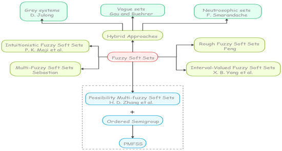 Algebraic structures are the main logistic tools for solving modern engineering problems and in various fields of applied sciences, which is why researchers are working on coupling these algebraic structures with modern methods of applied sciences. Initially, the concept of fuzzy sets in terms of semigroups was defined by Kuroki, who also related fuzzy ideals with semigroups [28,29,30]. Later, some properties of fuzzy sets in ordered groupoids were studied [31]. Kehayopulu and Tsingelis initiated the idea of fuzzy bi-ideals in ordered semigroups and also studied interior ideals for the same approach [32,33]. Khan et al. studied fuzzy interior ideals for ordered semigroups [34]. Jun et al. coupled the soft set theory with ordered semigroups [35]. Other researchers picked up the same concept and combined fuzzy soft sets with ordered semigroups [36,37]. Recently, Habib et al. initiated the idea of possibility fuzzy and multi-fuzzy soft ordered semigroups and possibility fuzzy soft ideals and related some of their applications via different operations [38,39,40]. Figure 1 illustrates a flow chart of fuzzy soft set theory, with the dotted section representing our proposed theory.