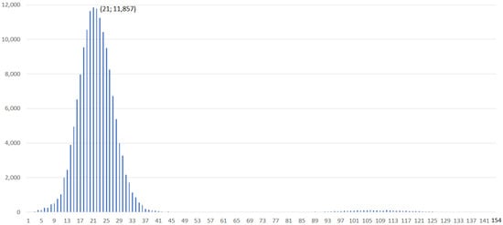 Each cyclically resolvable STS(57) has between 1 and 154 resolutions. The distribution of the number of point-cyclic resolutions of an STS(57) is presented in Figure 2. The maximal number 154 of point-cyclic KTS(57)s of one cyclic STS(57) is achieved by an STS(57) with a full automorphism group . There are  STS(57)s with 21 point-cyclic resolutions.