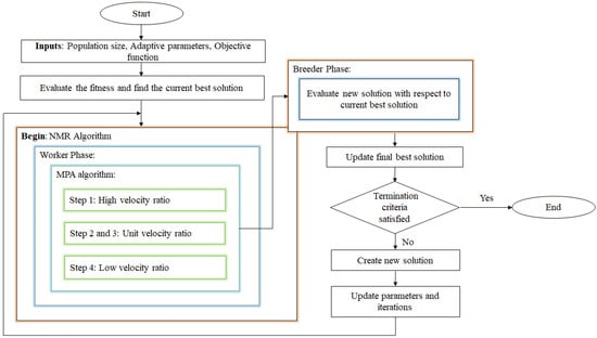 It is evident from the descriptions of MPA [] and NMRA [] that while both algorithms are effective, they have limitations with regard to MPA’s exploitation and NMRA’s exploration. The premature convergence of these algorithms leads to a stagnation of locally optimum solutions. Salgotra et al. [] developed a hybrid MPNMRA model that retains the basic NMRA architecture while modifying the worker phase and includes MPA’s mathematical formulation. The breeder phase is left unattended. In the algorithm, the worker phase is intended for exploration, whereas the breeder phase is intended for exploitation. A hybrid MPNMRA with effective exploitation and exploration arises by combining the two algorithms. In addition to the MPA and NMRA hybridization, the parameters of both algorithms are modified using the simulated annealing mutation operator [] to make the algorithm’s parameters self-adaptive. The algorithm is now self-sufficient and does not need user-based adjustment to evaluate the problem.
