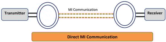 The architecture of direct MI communication involves a transmitter coil and a receiver coil, similar to transformers []. The transmitter coil carries a sinusoidal current that generates a corresponding sinusoidal current in the receiver coil through mutual induction, thereby facilitating communication [], as shown in Figure 2 [].