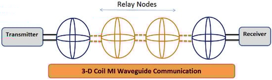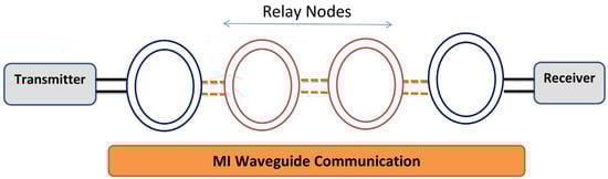 Waveguide-based MI communication utilizes waveguides, which are structures designed to guide and propagate electromagnetic waves to reduce transmission path loss and enhance the communication range in underground environments []. By employing waveguides, the communication signals can propagate over longer distances compared with direct MI communication. The use of waveguides in MI communication helps achieve a practical bandwidth for inter-sensor communication, enabling higher data rates and more efficient information exchange among sensors in WUSNs.