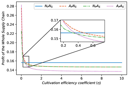 Lemma 1 reveals that in a basic downstream-dominant structure, the seller can obtain at least two-thirds of the overall profit of the whole supply chain, and the larger the provider’s product acquisition efficiency (i.e., is reduced) is, the more severe the seller’s relative exploitation of the provider (Note that and .). This is because the seller can achieve this by significantly lowering the procurement price. In contrast, a decline in acquisition efficiency (i.e., is increased) reduces the total revenue of the whole supply chain (Note that .). So, there exists a moderate level that can further maximize the provider’s profit, and an acquisition efficiency that is either too high or too low is detrimental to the provider.