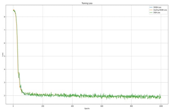 The training loss curves illustrate the convergence characteristics of three deep reinforcement learning models: DQN, DDQN, and Dueling DDQN. Initially, all three models start with a loss value of approximately 8.5. However, during the first 50 epochs, the loss rapidly decreases, indicating efficient initial learning and parameter optimization. Around the 100th epoch, the loss curve shows a clear inflection point, after which the rate of change gradually slows down. From epoch 200 onward, the loss stabilizes at around 2.0, with minimal fluctuations, indicating that the models have reached a stable convergence state. During the later stages of training (epochs 400 to 1000), the curves remain stable, validating the effectiveness of the chosen hyperparameters, gradient descent optimization method, and training strategy. All three models successfully converge and find their optimal parameters.
