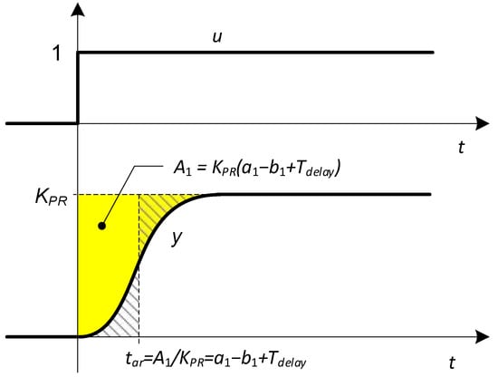 The first and higher process moments can also be calculated directly from the input signal (u) and the output signal (y) of the process during the steady state change [,,]. The moment is equal to an integral (area A1) between the scaled process input and the process output when the initial values of the signals are equal to zero and the total change of u is equal to 1 [,,]: