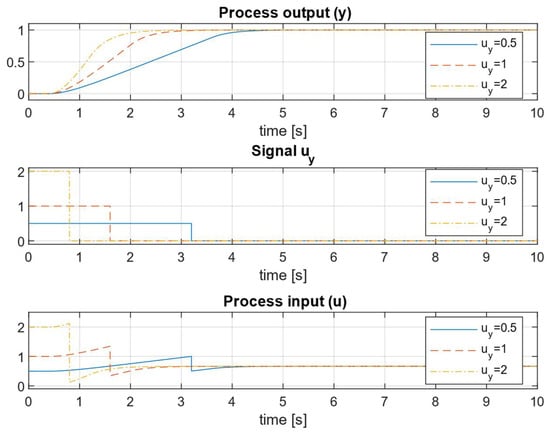 In this case, the change of the process steady-state output (Δy(∞)), according to Equations (9) and (11), depends on the integral of the signal uy: