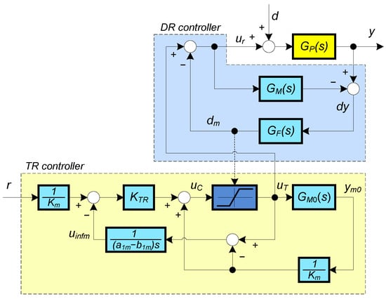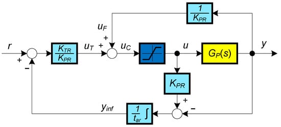 where y(∞) is calculated from Equation (9) and KTR is the controller tracking gain. In this case, the proposed tracking control concept can be represented by the block diagram shown in Figure 4. The reference signal is denoted by letter r. The dark blue block represents the controller or the process input signal limitations, where uC is unlimited and u is a limited control signal.